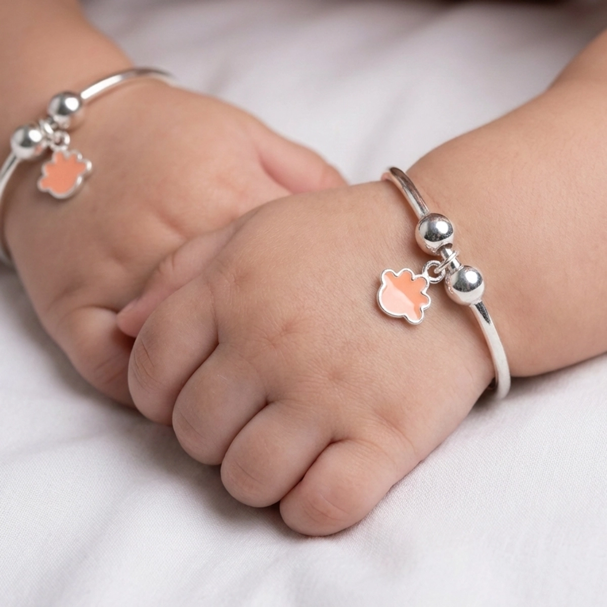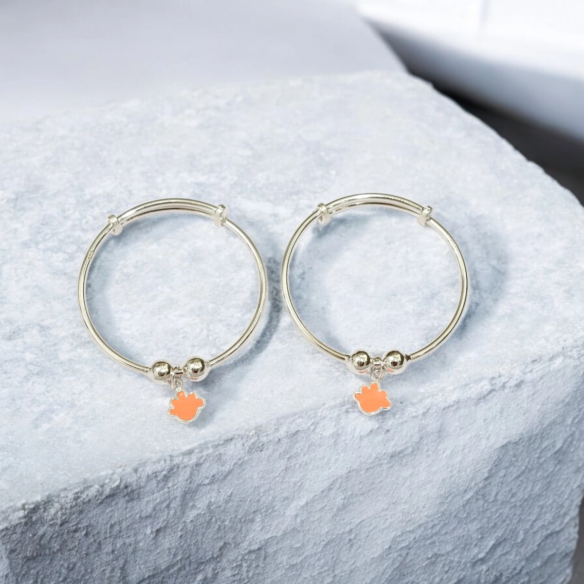 Perfect for the little animal lover in your life, the Playful Peach Paw Print Kids Kadali is a sweet nod to their favorite four-legged friends. This minimalist pair features a clean, polished silver tube design centered around a single, charming motif: a tiny paw print finished in a warm, soft peach enamel. Suspended between two silver beads, the charm is small, lightweight, and fuss-free, making it ideal for daily wear. Whether they love puppies, kittens, or just cute things, this accessory adds a touch of joy to their wrist. Crafted from high-polished 925 Sterling Silver, the peach paw print kids kadali come with a smart, adjustable sliding mechanism that ensures a secure fit as your child grows.