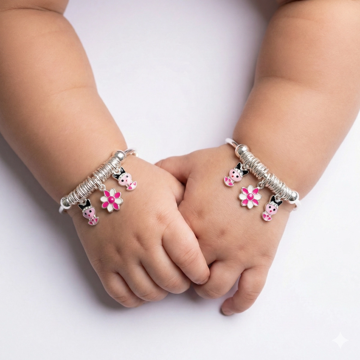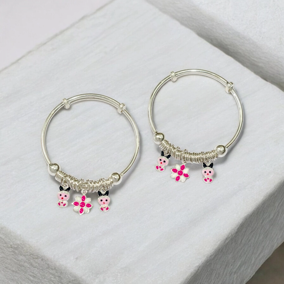 Create happy memories with the Playful Pink Mouse Flower Kids Kadali. Designed for the little one who loves all things cute and colorful, this pair brings a touch of whimsy to any outfit. The centerpiece is a lovely white flower with bright pink accents, symbolizing the bloom of childhood. Flanking the flower are two adorable cartoon mouse-style charms, detailed with black ears and sweet pink bows. The delightful mix of pink, white, and black enamel pops against the shiny silver coil, making these pink mouse flower kids kadali a fun accessory they won’t want to take off. The smart, adjustable sliding design ensures a comfortable fit that grows along with your child.
