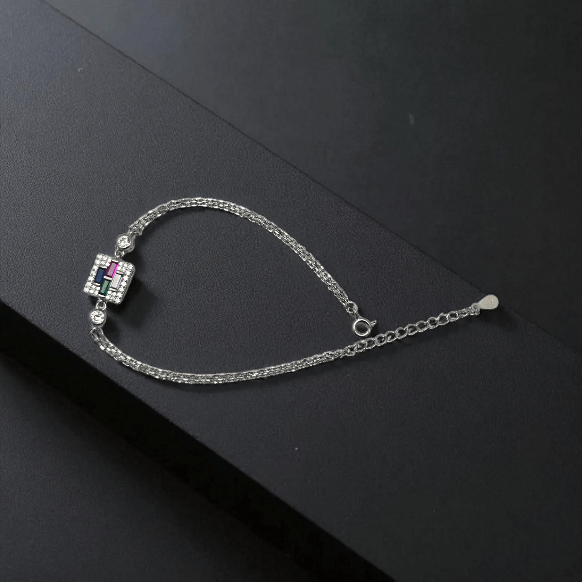 The Prism Bloom Bracelet is a radiant expression of modern elegance, crafted in pure 925 silver. Its centerpiece features a striking geometric cluster of rainbow-hued baguette-cut stones, encircled by a halo of brilliant white CZs. A fine dual-strand chain adds a touch of delicate refinement, effortlessly pairing with both western and ethnic attire. Whether worn solo or stacked, this bracelet brings a playful pop of color with sophisticated charm.