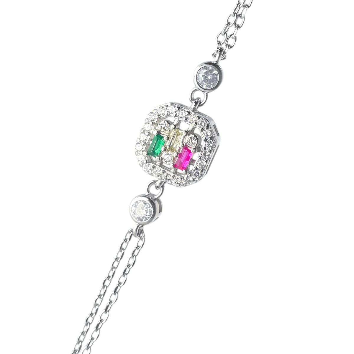 Bring a touch of vibrant luxury to your wrist with the Prismatic CZ Charm Bracelet. Its centerpiece showcases a gleaming bar of baguette-cut CZ stones in radiant green, yellow, and pink, nestled within a bed of micro pavé white CZs. Dual chains accented with bezel-set solitaires on either side enhance its graceful appeal. Minimal yet striking, this bracelet is perfect for stacking or wearing solo – a true conversation starter in any setting.
