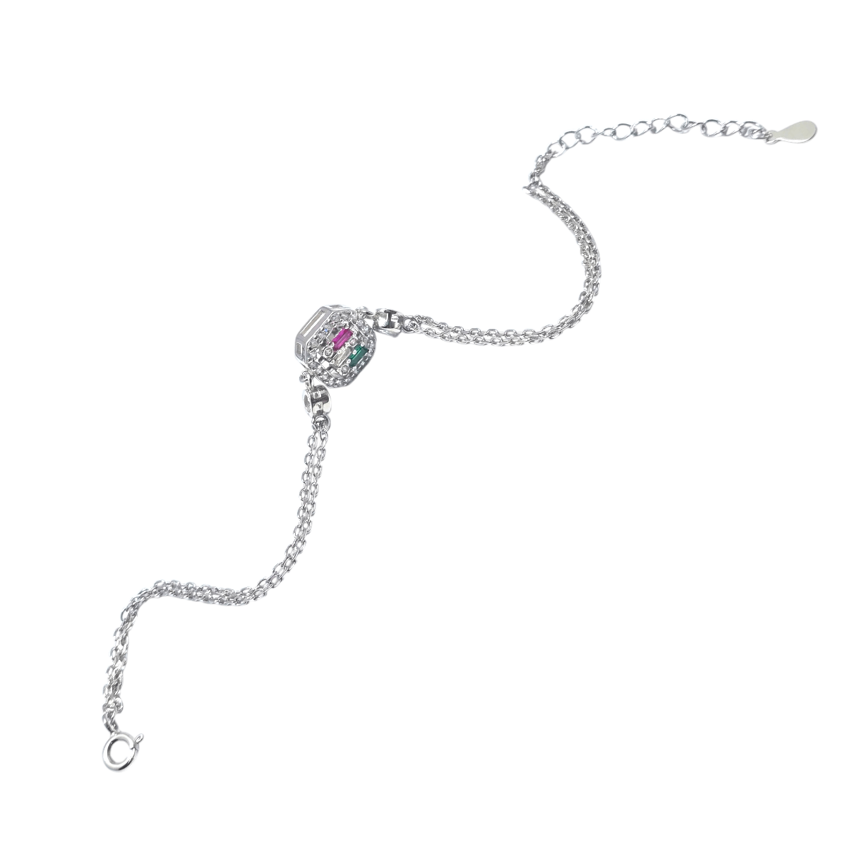 This modern silver Prismatic CZ Charm Bracelet features emerald-cut colorful CZ stones framed in pavé brilliance – versatile, radiant, and perfect for daily wear or special occasions.