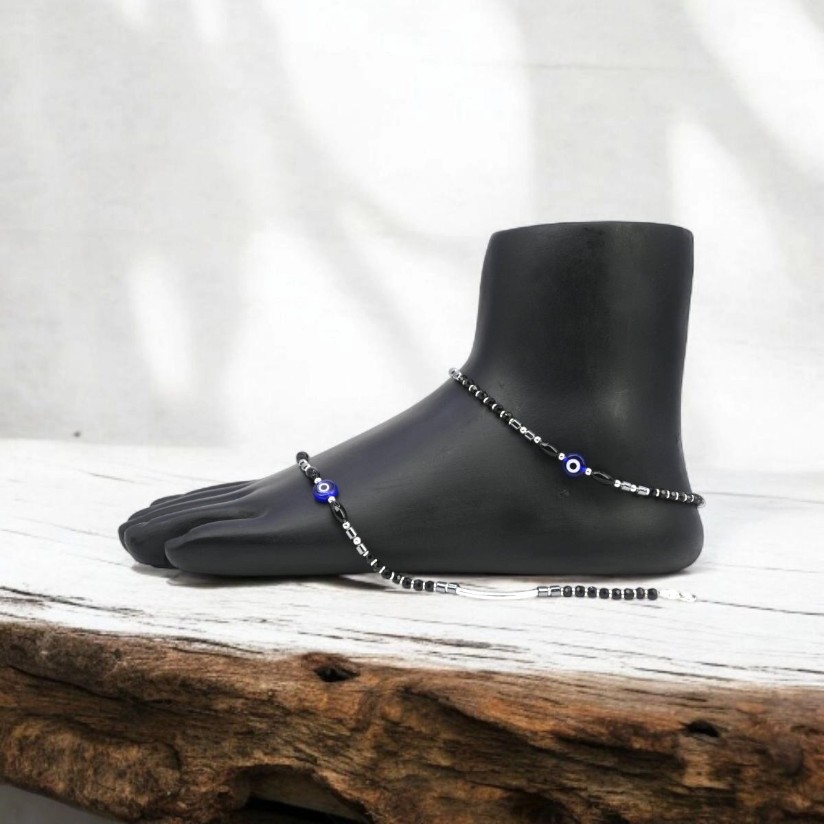 Embrace a tradition of protection with a modern, bohemian twist. Our Black Bead Nazariya Anklets is thoughtfully designed to be both a shield against negativity and a chic fashion statement, combining classic Nazariya black beads with the powerful symbolism of the Evil Eye. The anklet is handcrafted with gleaming, faceted black beads that contrast beautifully with polished 925 sterling silver accents. At its heart lies a vibrant blue Evil Eye charm, creating a captivating focal point. This beautiful piece may also feature a delicate extension to be worn as a toe ring for added flair.