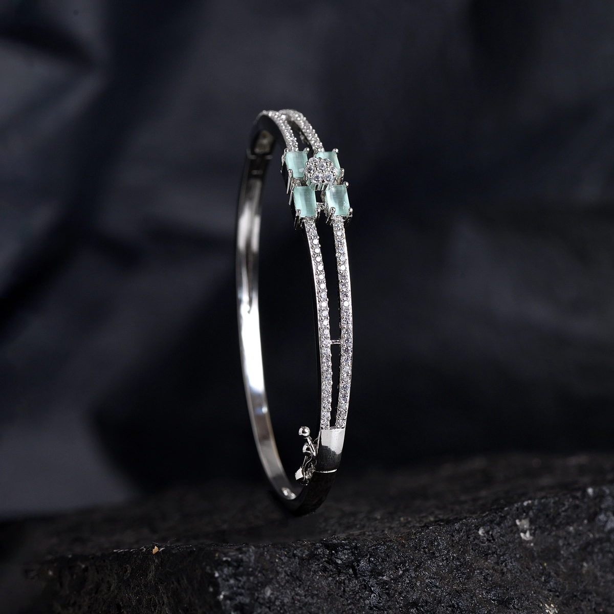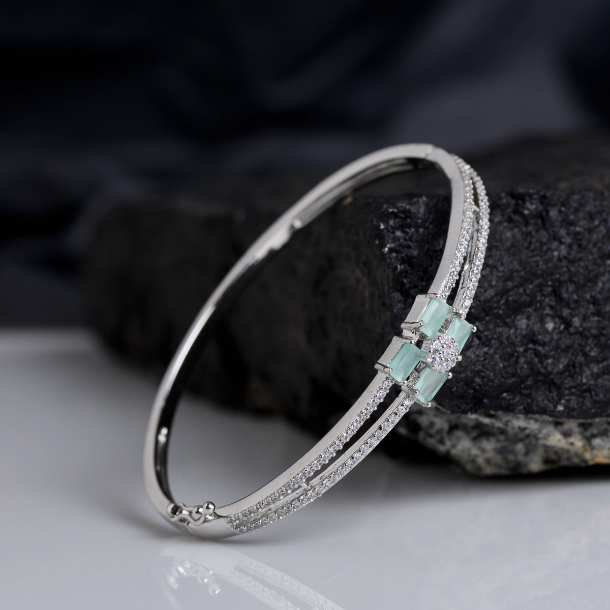 Make a statement with our Quad Green Stone CZ Bracelet – 925 Silver. Featuring four soft aqua-green stones surrounding a dazzling CZ cluster, this bracelet is a symbol of grace and modern artistry. Its double CZ-studded band enhances the brilliance, while the sleek design makes it versatile for both everyday elegance and special occasions. A refined accessory that speaks of subtle luxury.