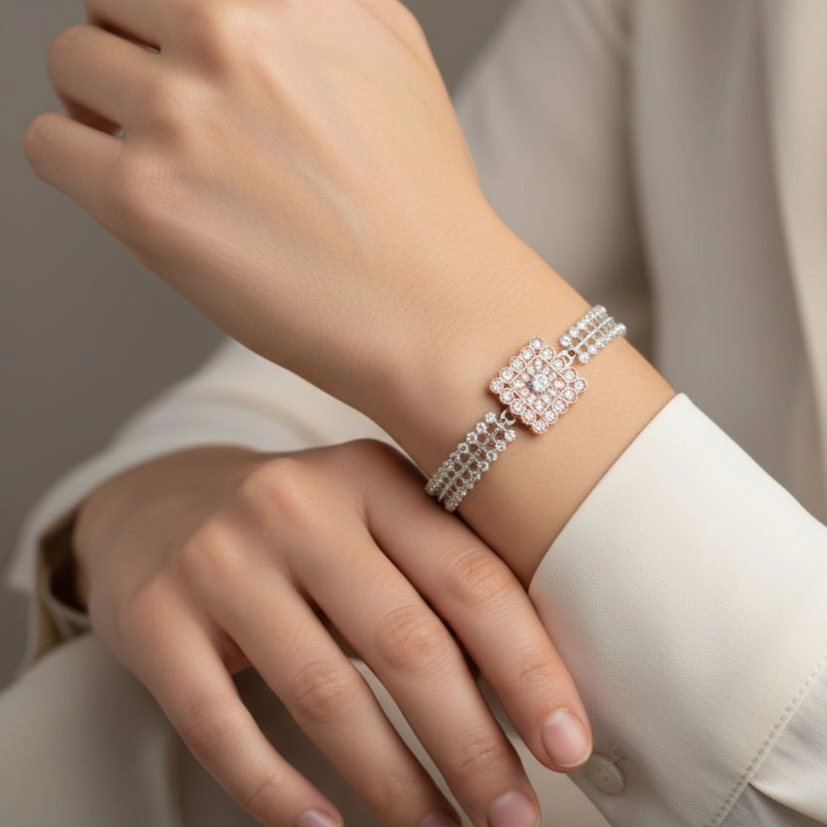 Designed for maximum glamour, our Regal Dual-Tone CZ Statement Bracelet is a true showstopper for the festive season. The centerpiece is a magnificent square medallion, finished in a warm rose gold polish and featuring a large, brilliant-cut CZ solitaire in a starburst setting. This is framed by a delicate, scalloped halo of pave CZs. The band itself is a testament to luxury, composed of multiple rows of sparkling clear CZs, all set in brilliant 925 silver. This is the ultimate accessory for weddings, Diwali, and grand celebrations.