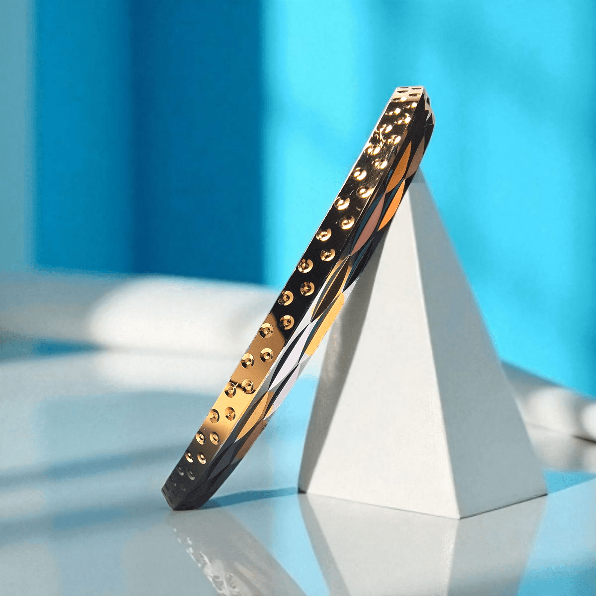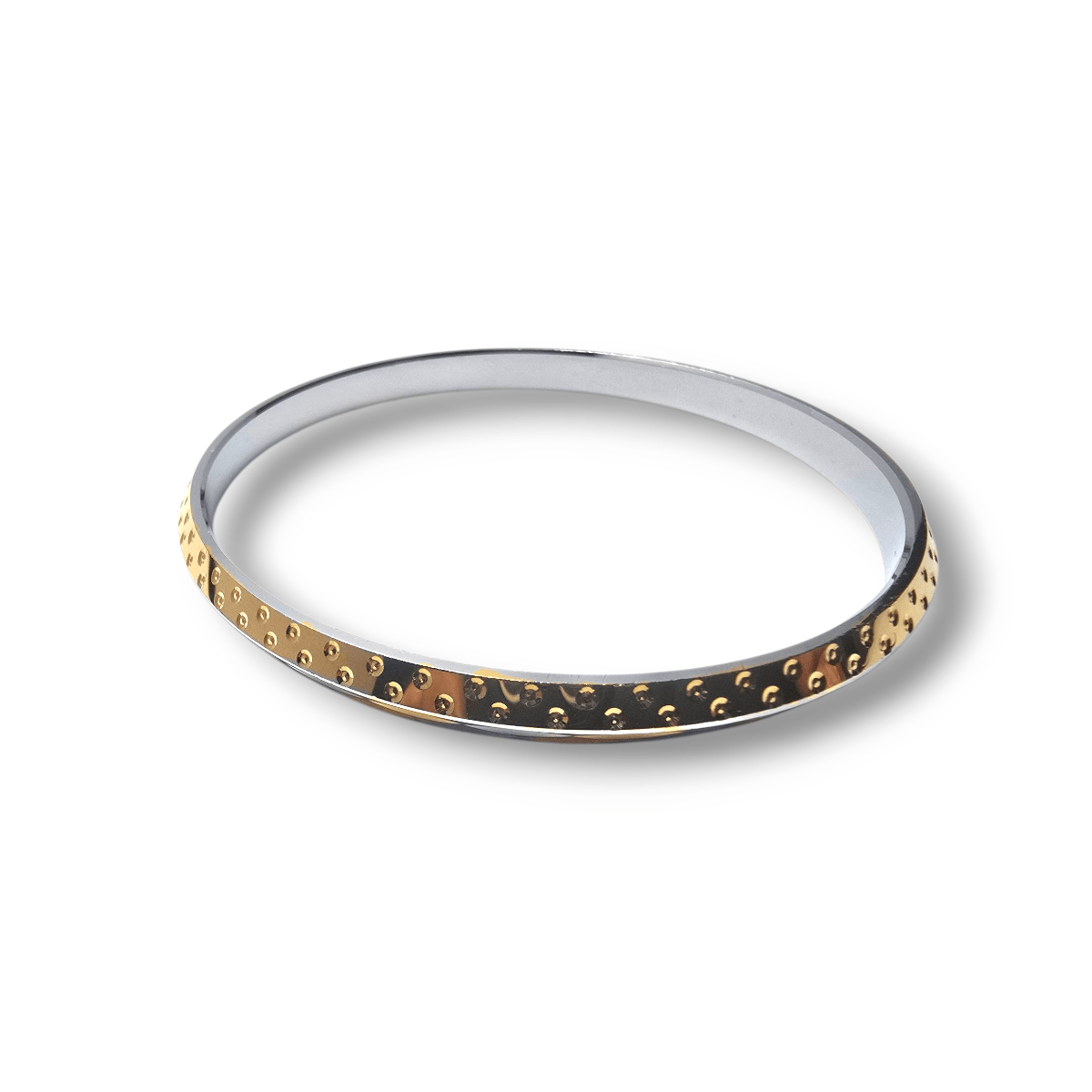 Introducing the Regal Echo Kada, crafted in silver and detailed with a radiant gold-polish dotted texture that reflects subtle masculinity. The clean, modern silhouette blends traditional roots with urban charm, making it a perfect everyday signature. Finished with precision and a slim, structured fit, this kada speaks volumes with its minimalism.