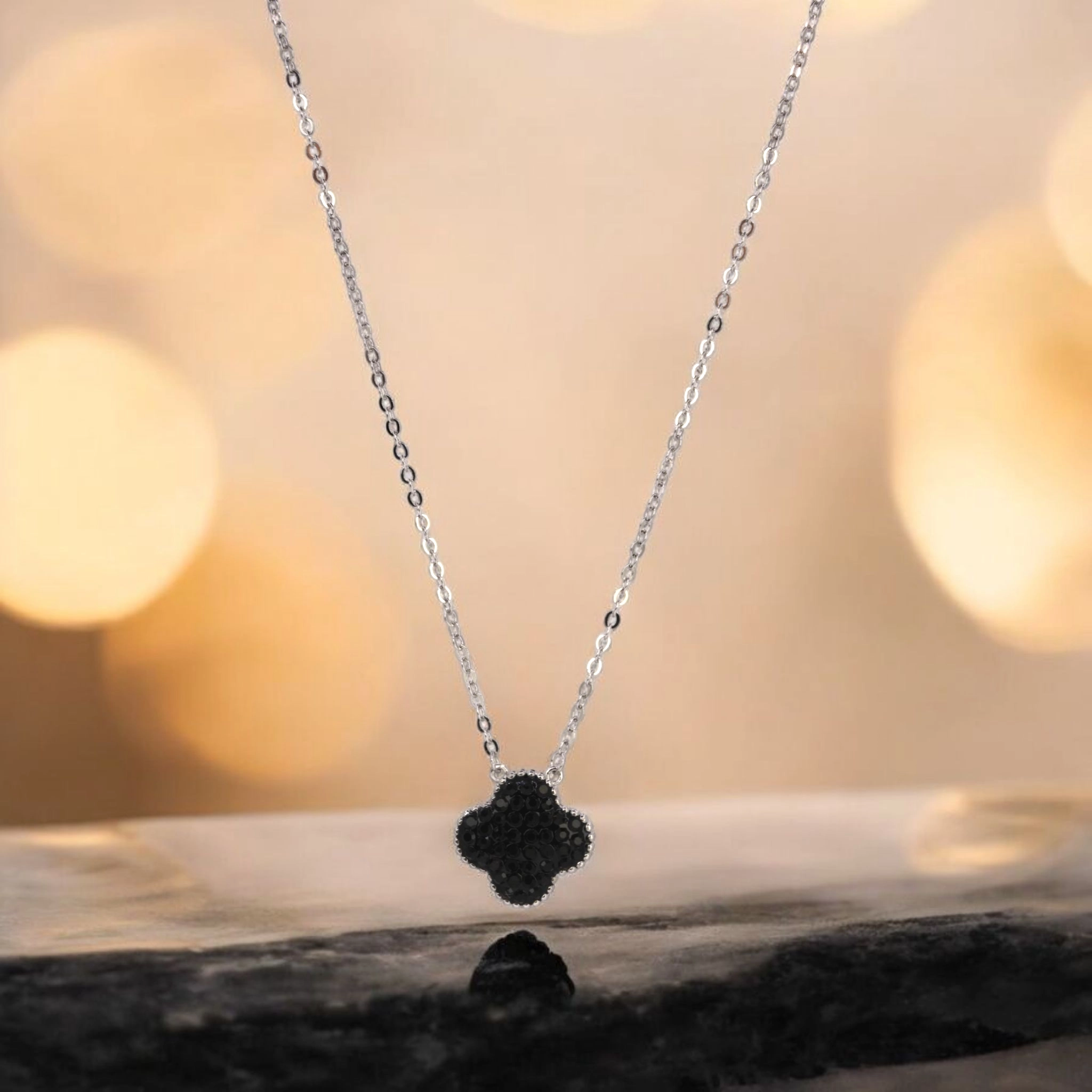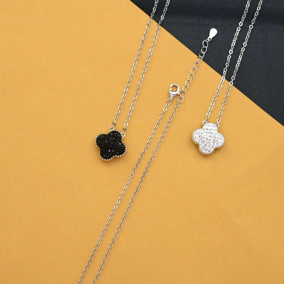 - Design: Reversible four-leaf clover pendant, paved white CZ on one side, black CZ on the reverse