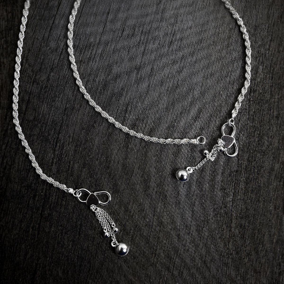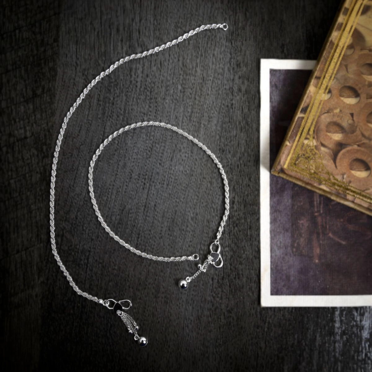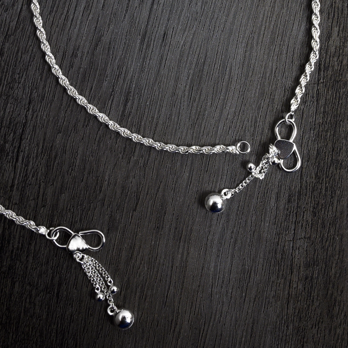 These Rope Chain Anklets are a timeless pair of 925 silver anklets featuring an elegant twisted rope chain design, finished with dangling silver balls for a touch of tradition and melody.