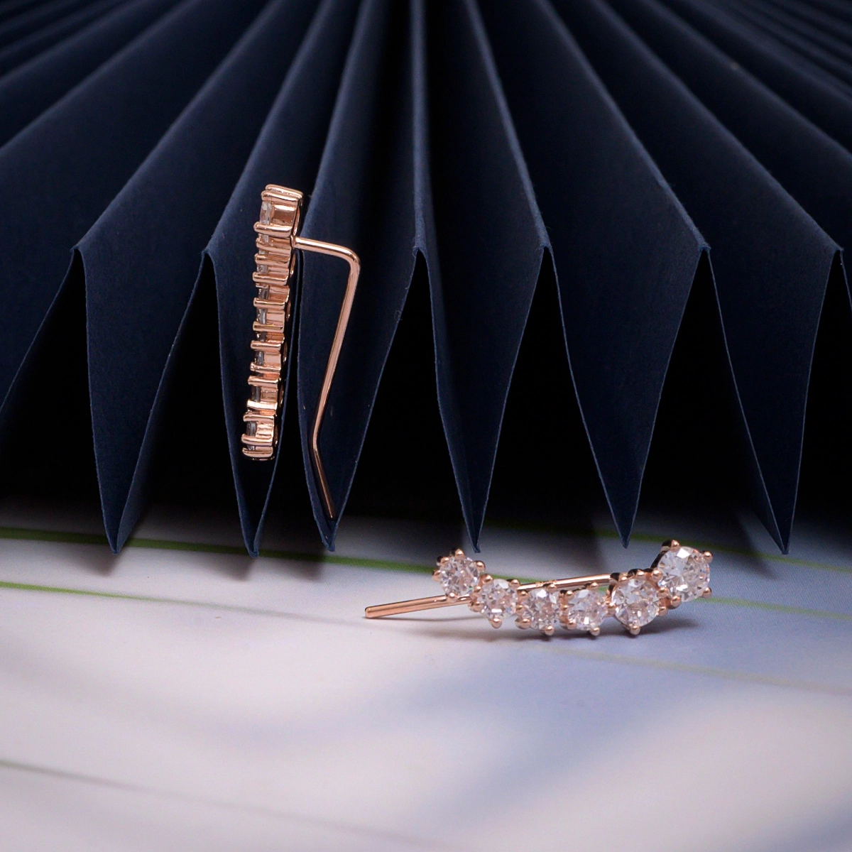 These modern Rose Gold CZ Ear Climbers sweep up the earlobe with a line of graduated brilliant cut CZ, delivering high impact without multiple piercings. The slim rose gold plated framework blends into the skin tone, letting the stones take center stage while the secure climber back keeps them comfortably in place. Crafted in 925 sterling silver for hypoallergenic wear, they add an instant touch of glam to everyday outfits and evening edits alike.