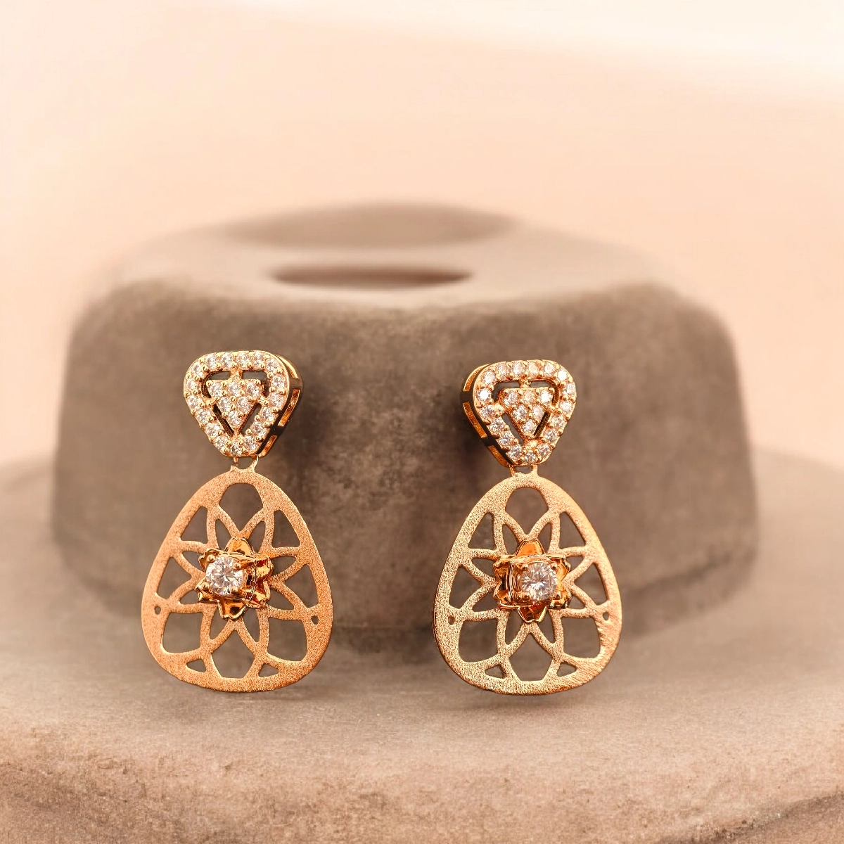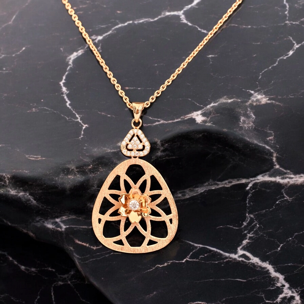Embrace modern femininity with this chic rose gold openwork teardrop necklace set featuring an airy openwork teardrop design, a geometric floral center, and sparkling crystal accents.