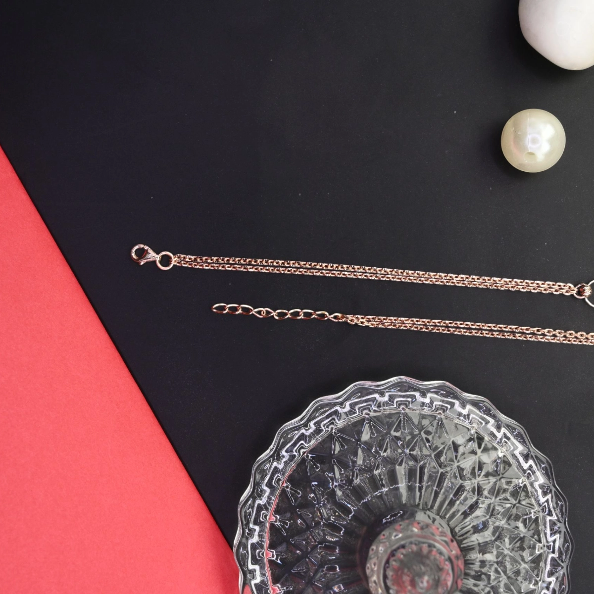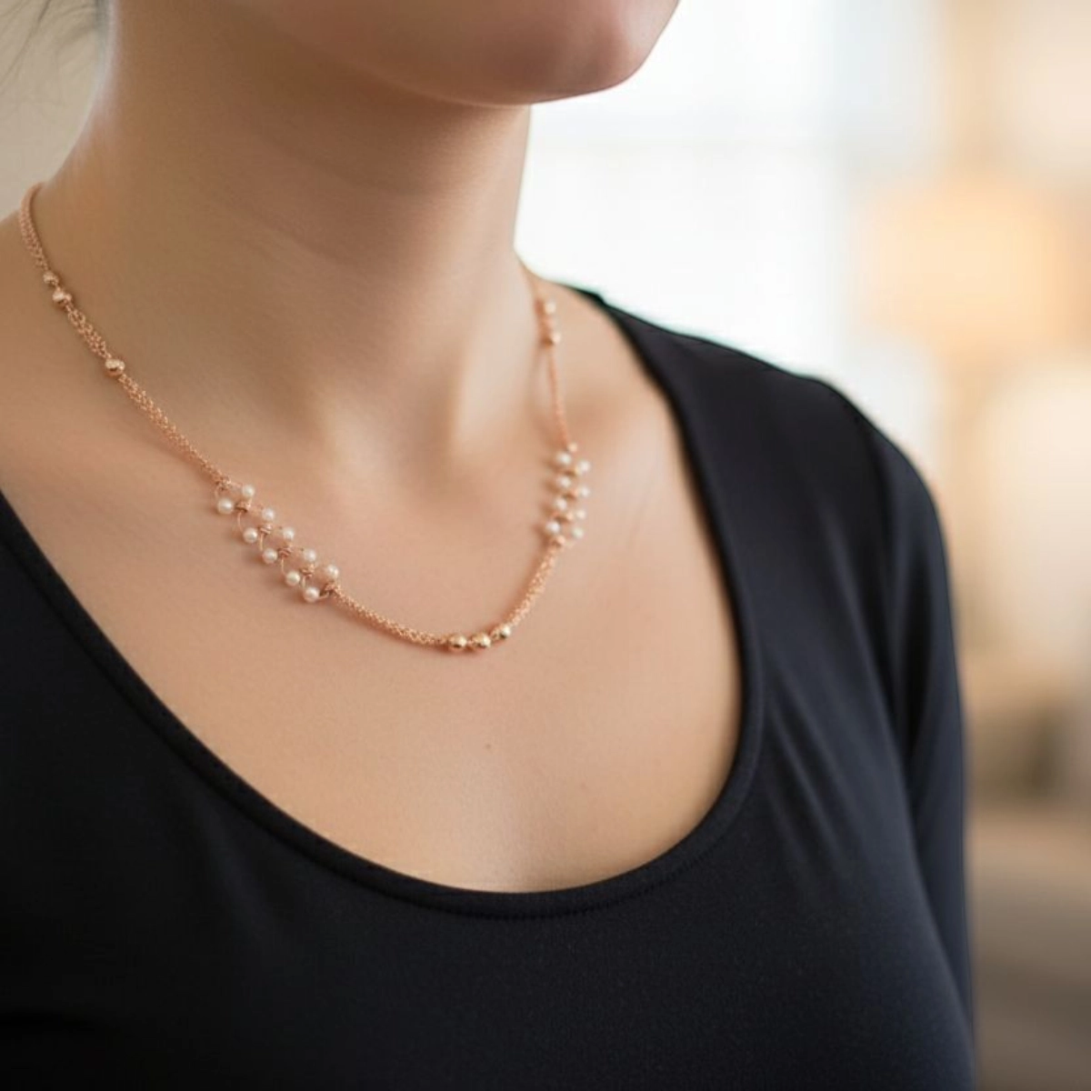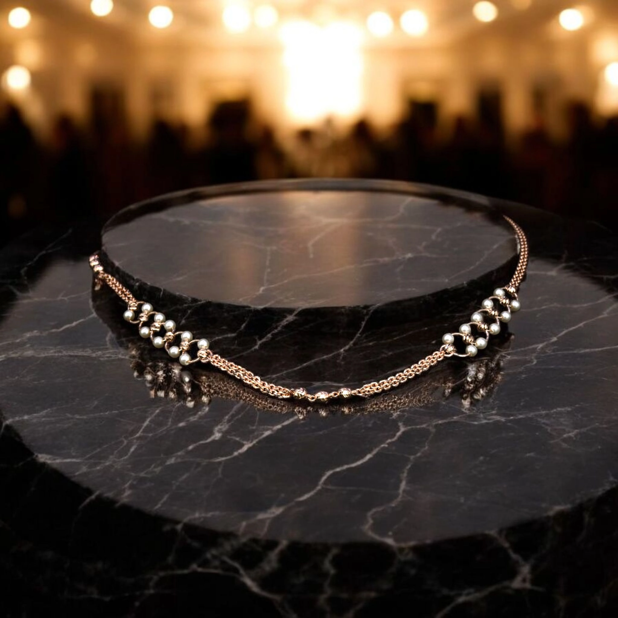 • Lustrous Pearl Clusters: Clusters of luminous pearls provide a rich, multi-dimensional glow against the warm rose gold.