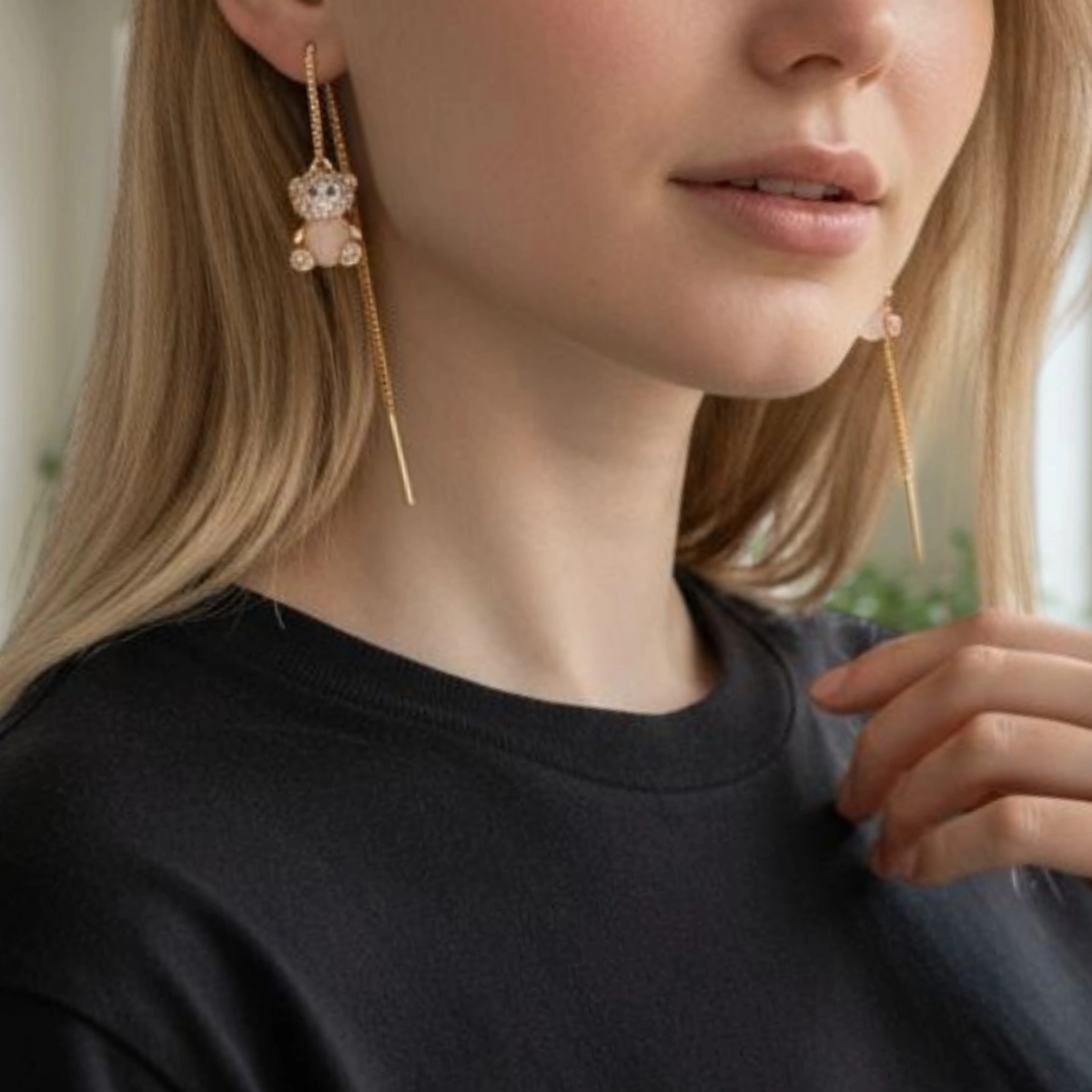 - Design: Threader earring with a pave-set teddy bear charm drop