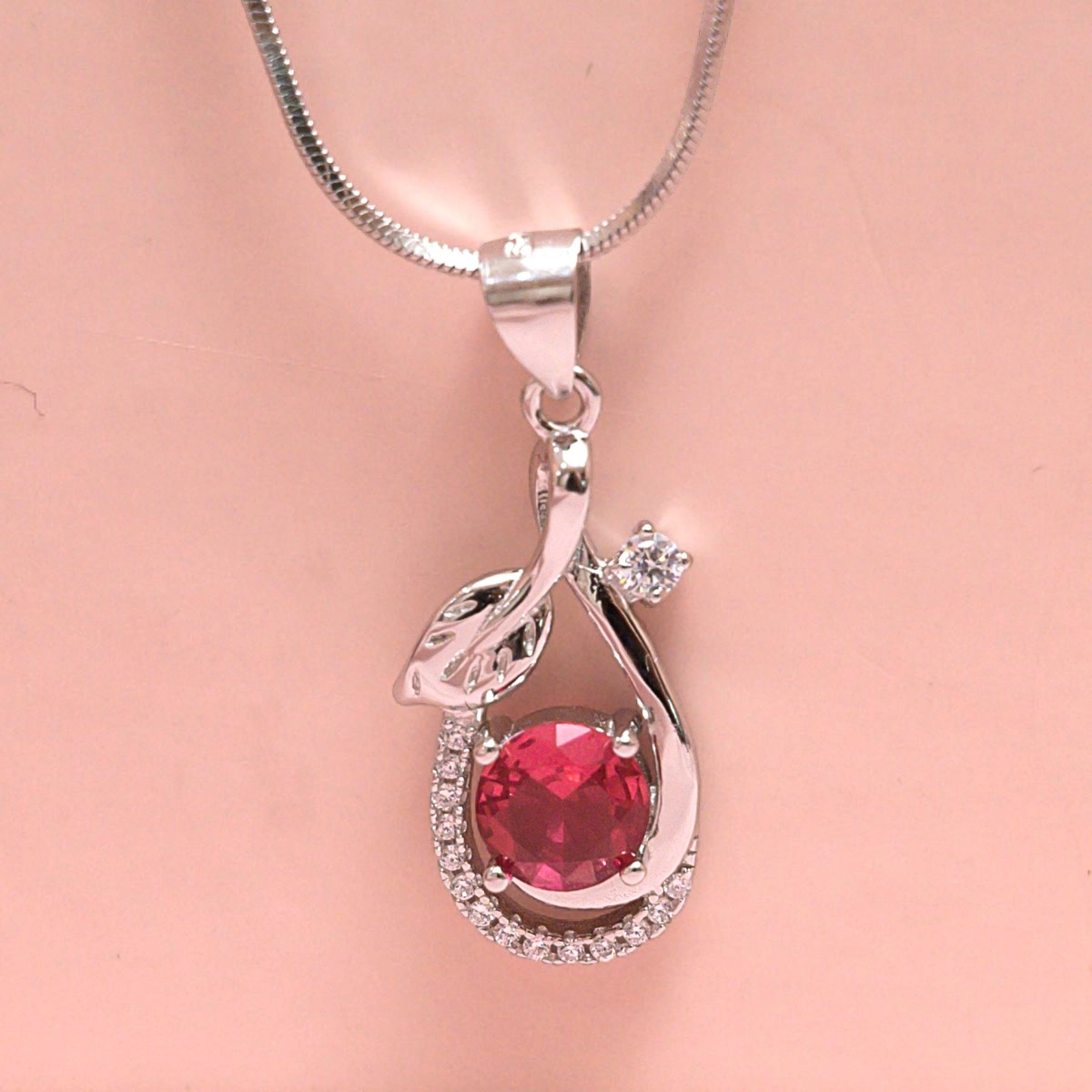 This Ruby Red Bloom Pendant Necklace features a graceful nature-inspired pendant in 925 sterling silver, featuring a brilliant round-cut ruby red gemstone framed by sparkling cubic zirconia, delicate leaf detailing, and fluid curves — a timeless symbol of beauty and elegance, paired with a sleek chain.