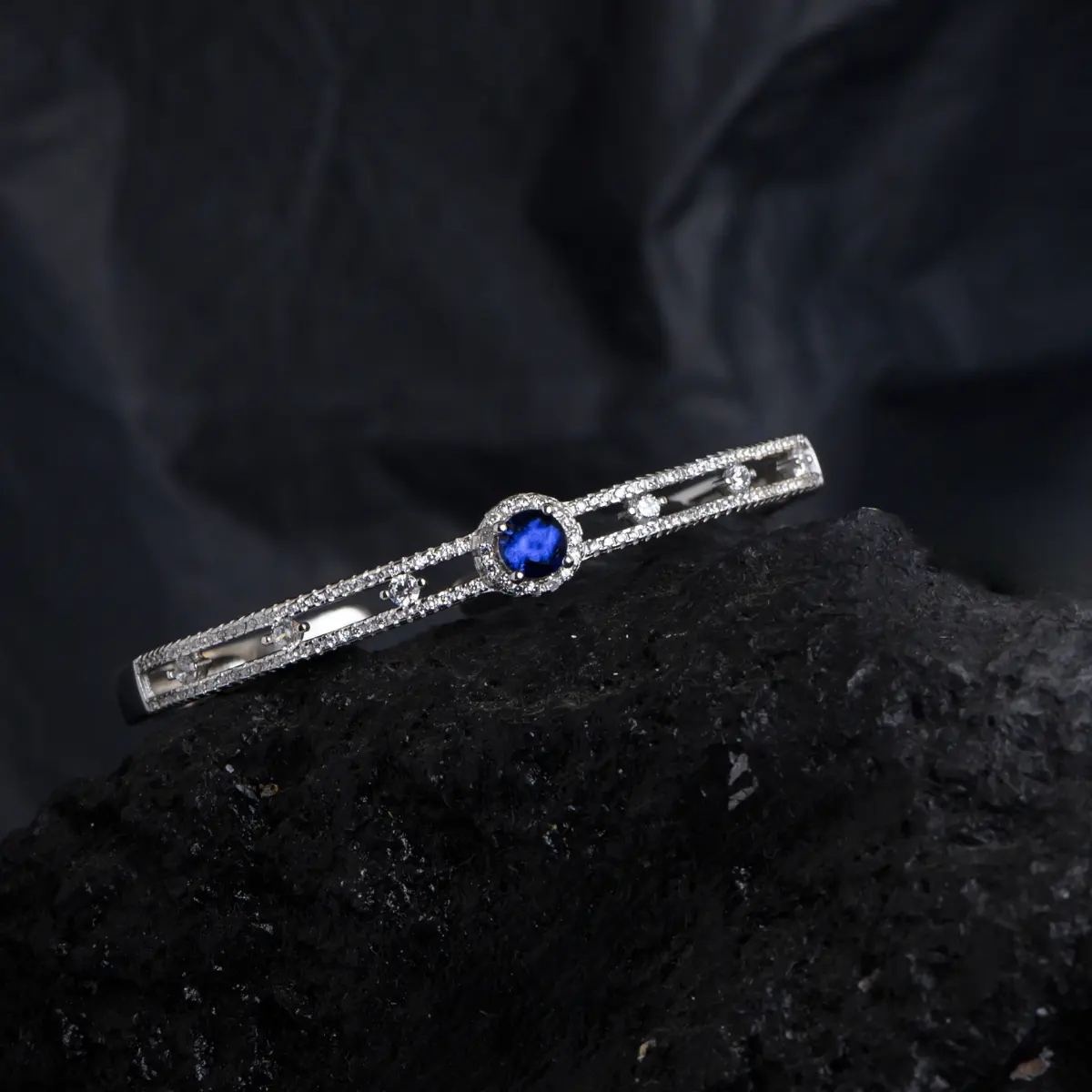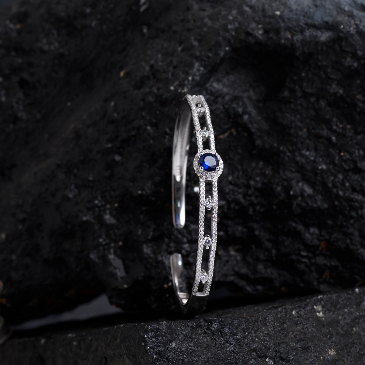Grace your wrist with refined sophistication through the Sapphire Elegance Bracelet. Designed in pure 925 sterling silver, it features a brilliant sapphire at the center, framed with sparkling cubic zirconia. The open-link pattern adds a modern flair, making this bracelet perfect for both everyday elegance and evening glamour.