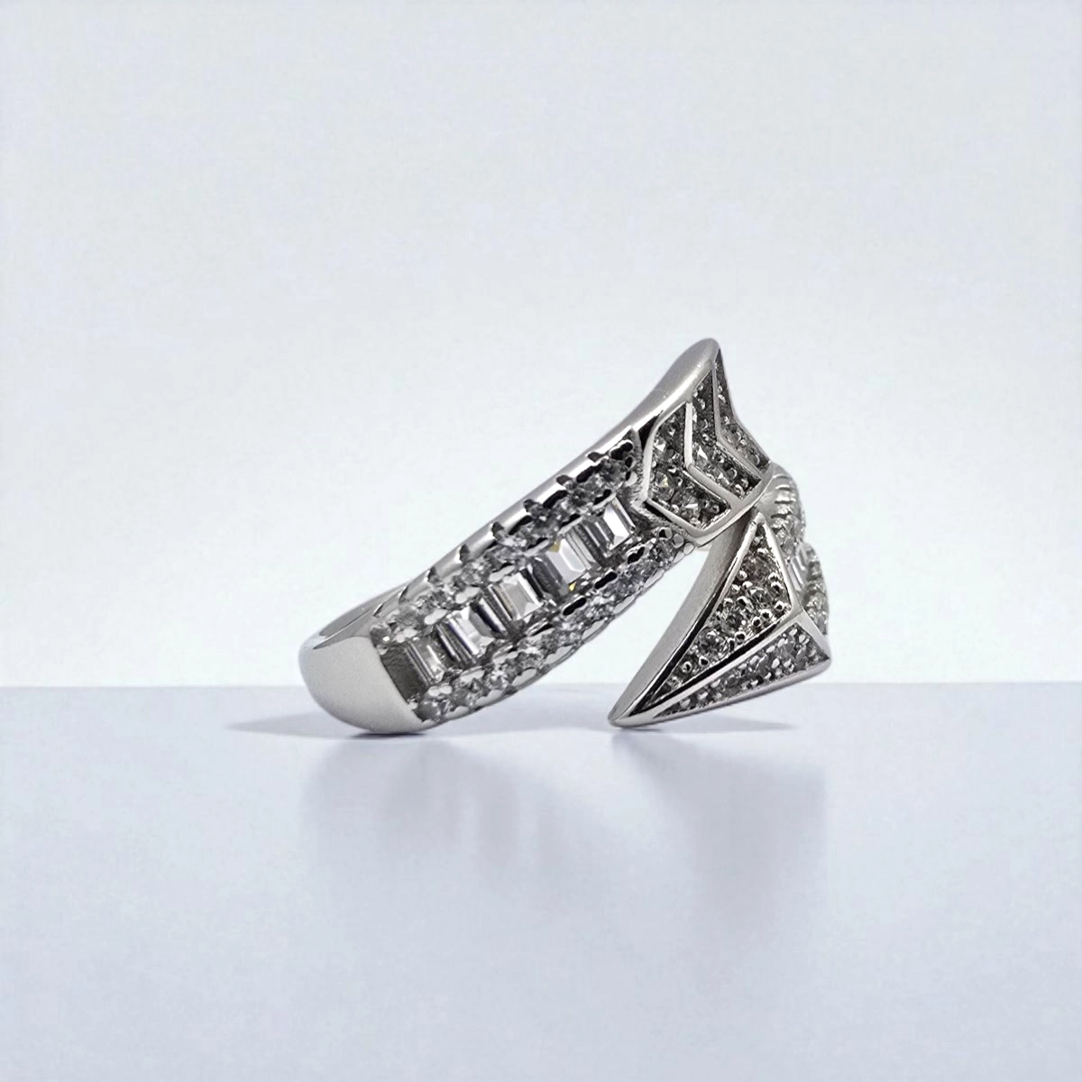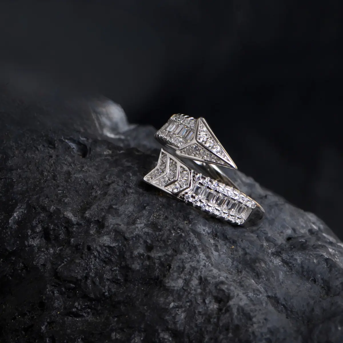 This Arrowline Ring is a confident open-wrap ring featuring twin arrow tips and a sleek baguette CZ channel—minimal lines, maximum intent.