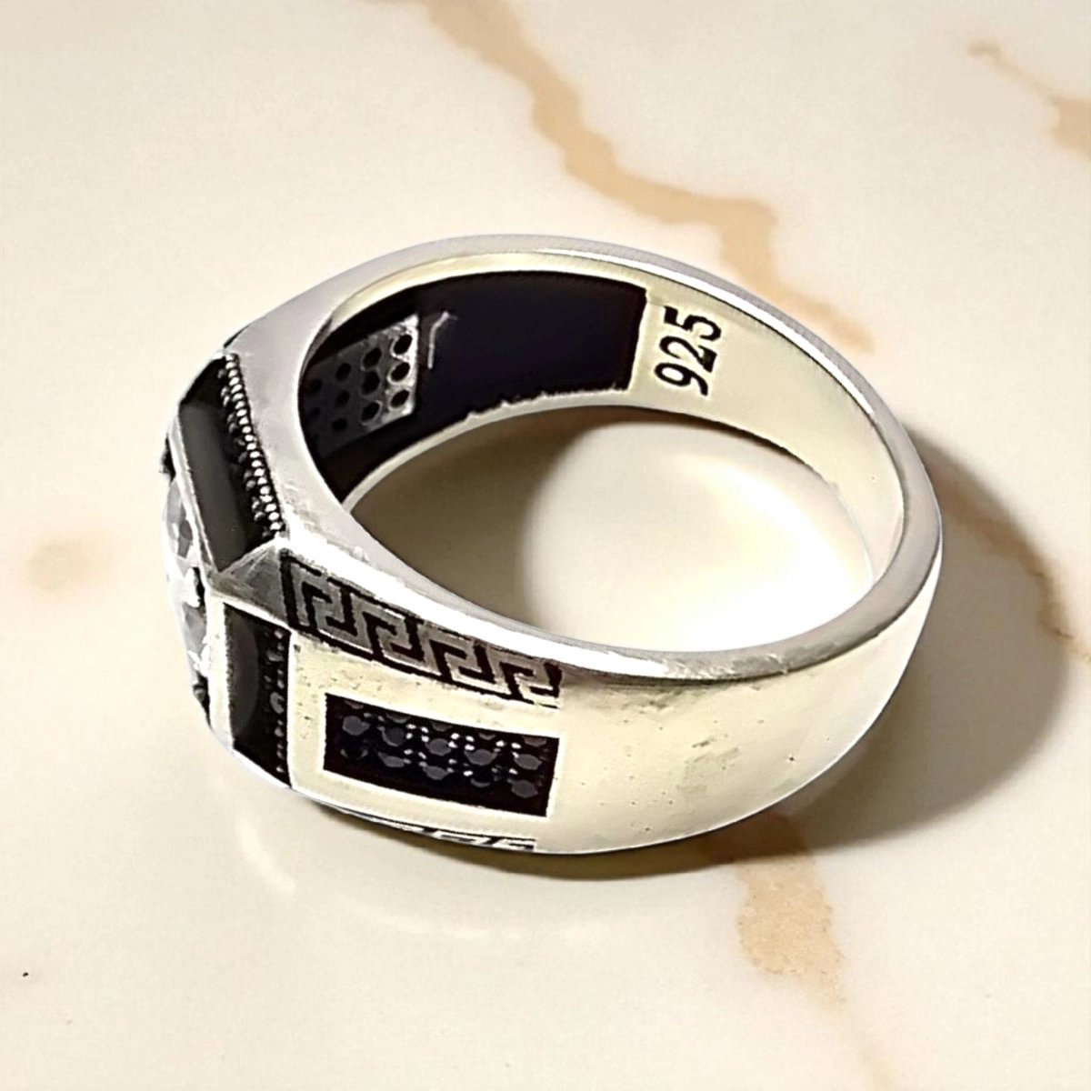 - Contrasting black CZ stones for a regal, masculine vibe