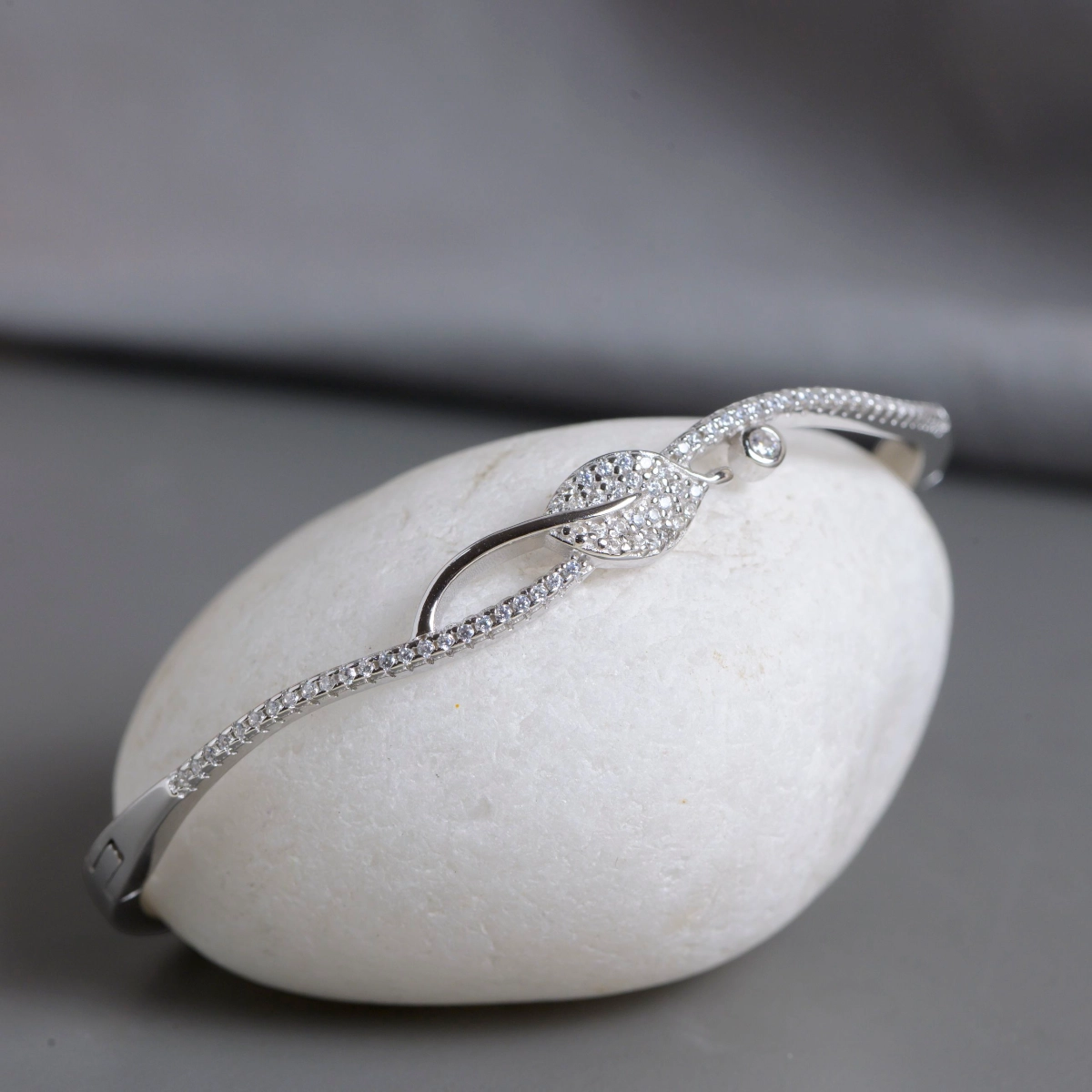 Inspired by the graceful forms of nature, our Sparkling Leaf Bracelet is a captivating piece that combines fluid design with brilliant sparkle. Crafted from premium 925 sterling silver, this bangle features a sleek, open-ended wave that wraps beautifully around the wrist. The centerpiece of the design is an intricately detailed leaf motif, which, along with a portion of the wave, is meticulously paved with shimmering Cubic Zirconia (CZ) stones. The contrast between the smooth polished silver and the dazzling, pavé-set stones creates a dynamic and luxurious effect. This bracelet is a comfortable, secure, and sophisticated statement piece that can be worn for any occasion, from an elegant evening out to adding a touch of glamour to your daily look.