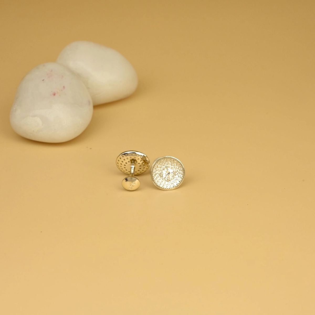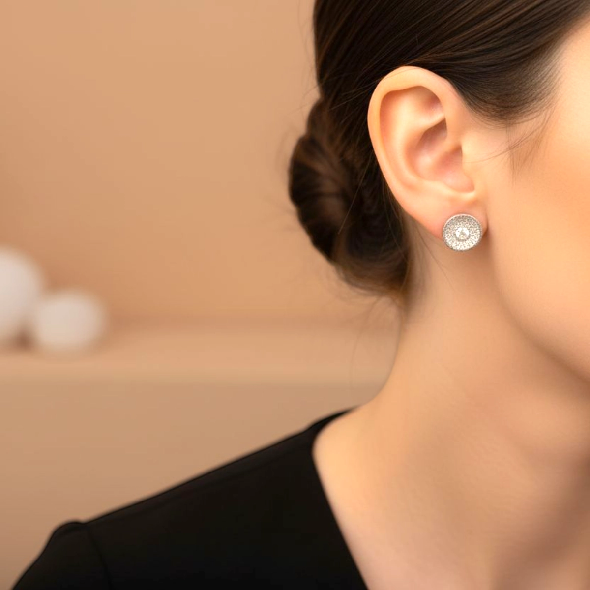 Our Sparkling Pave Dome Stud Earrings are the essence of wearable luxury, providing a spectacular, diamond-like glow in a comfortable size. Designed with a gentle, rounded dome profile, these earrings are completely blanketed in hundreds of micro-pave set Cubic Zirconia (CZ) stones. The stones are set in concentric circles, creating an intense, continuous sparkle that mimics the look of a large solitaire or a brilliant disco ball of light. Secured with a comfortable post back, these earrings are an effortless way to add glamour to your day-to-evening style.