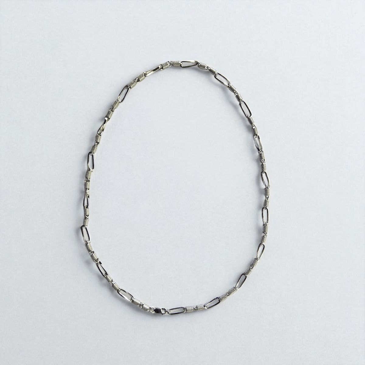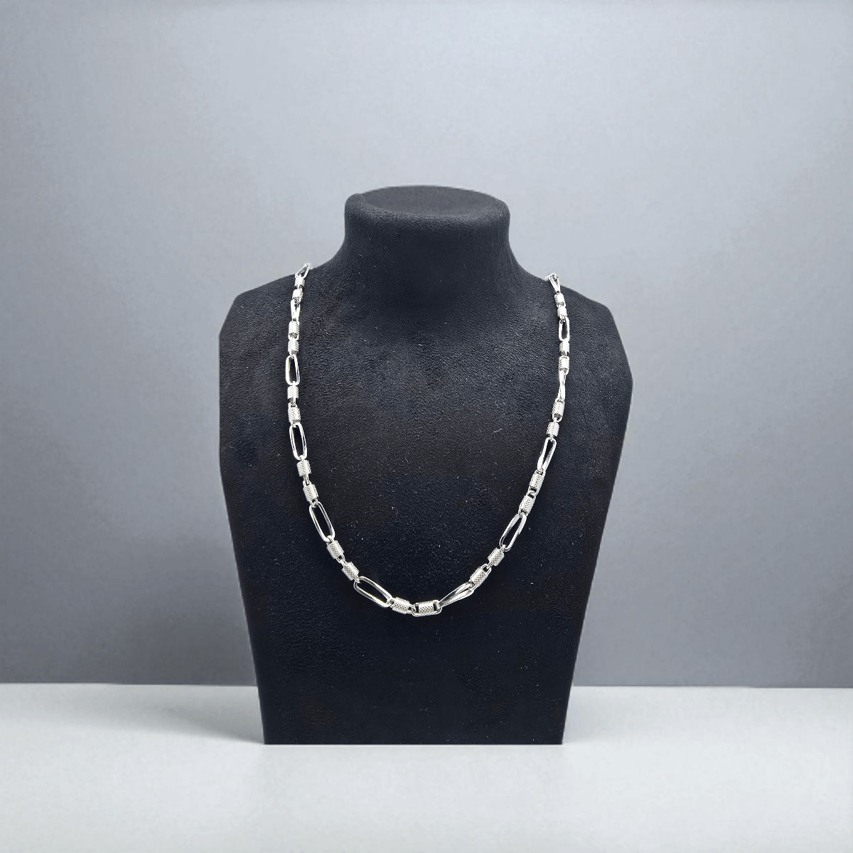Elevate your look with this finely engineered Textured Oval Link Gents Chain in 925 sterling silver. Featuring alternating oval and textured barrel links, it strikes the perfect balance between sleek and rugged. The chain’s dual-finish surface — polished smooth and precision-textured — adds visual depth and tactile appeal. Finished with a secure lobster clasp and rhodium plating for anti-tarnish brilliance, it’s a versatile piece that transitions seamlessly from casual to formal.