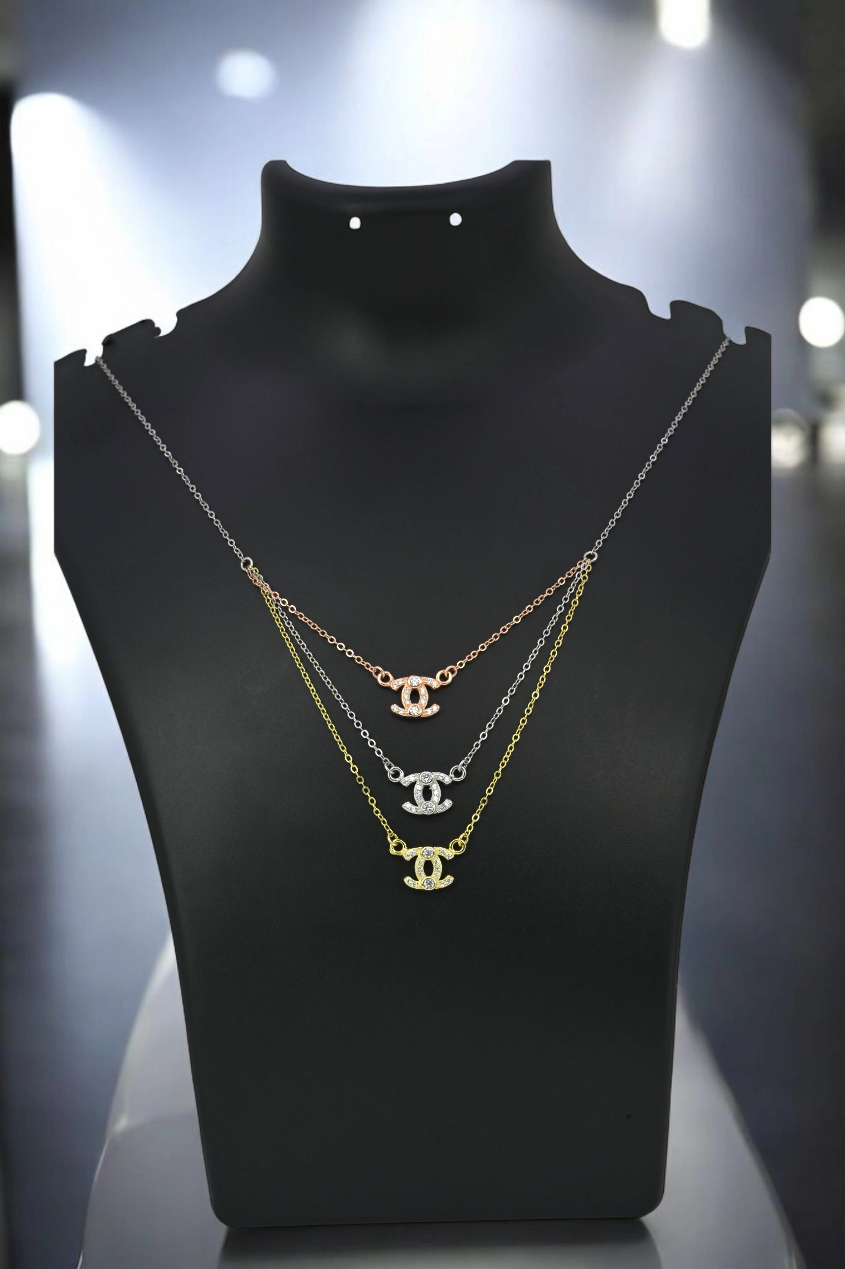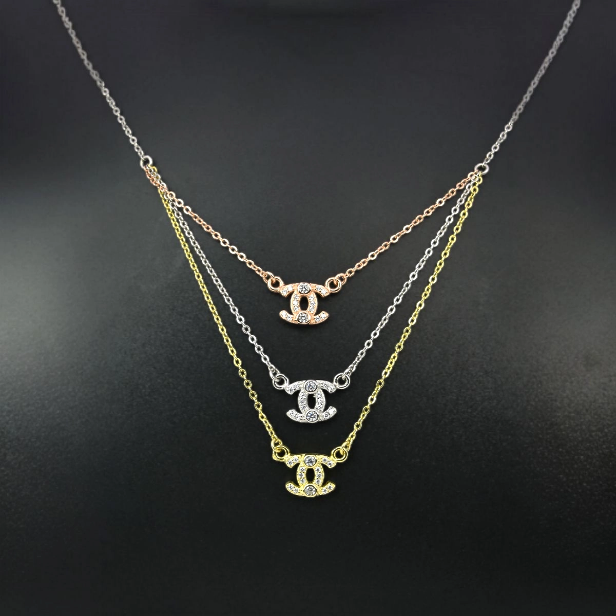 - Design: Triple-layer necklace with interlocking oval CZ pendants in three different tones