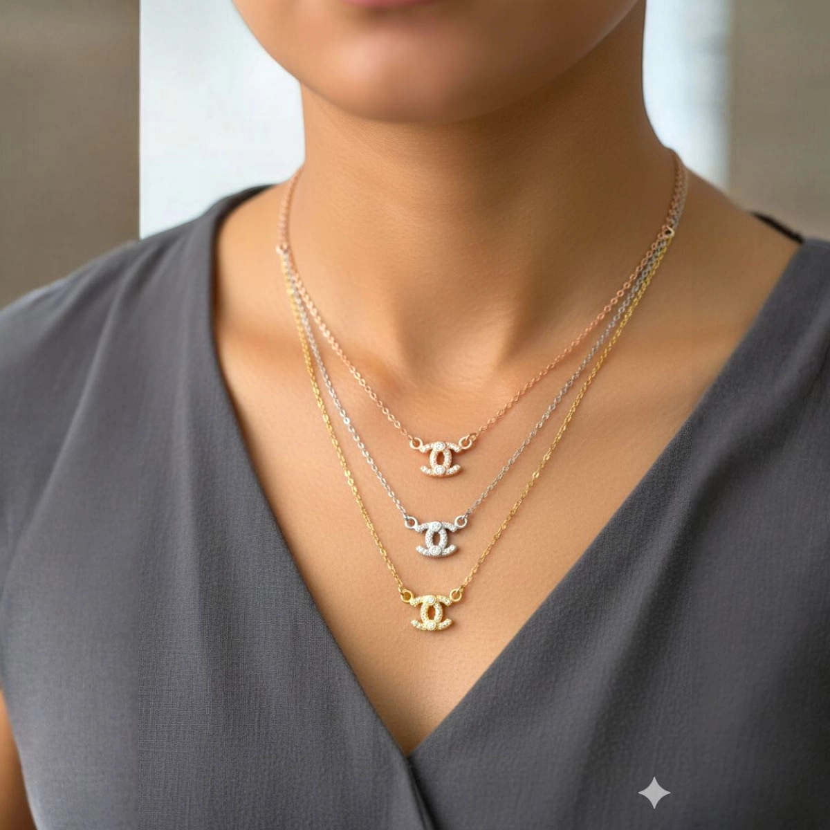 Our Triple-Layer Interlocking Oval Necklace offers an effortlessly chic and luxurious layered look in one convenient piece. This elegant triple-layer interlocking oval necklace features three delicate chains, each adorned with a sparkling pendant, all attached to a single clasp for perfect styling. The shortest chain glows in a warm rose gold polish, the middle chain shines in brilliant silver, and the longest chain radiates in a rich gold polish. Each chain suspends an identical interlocking oval motif, meticulously paved with dazzling Cubic Zirconia (CZ) stones. This necklace is a stylish and versatile accessory, perfect for adding a touch of sophisticated glamour to your festive outfits for Diwali and other special occasions.