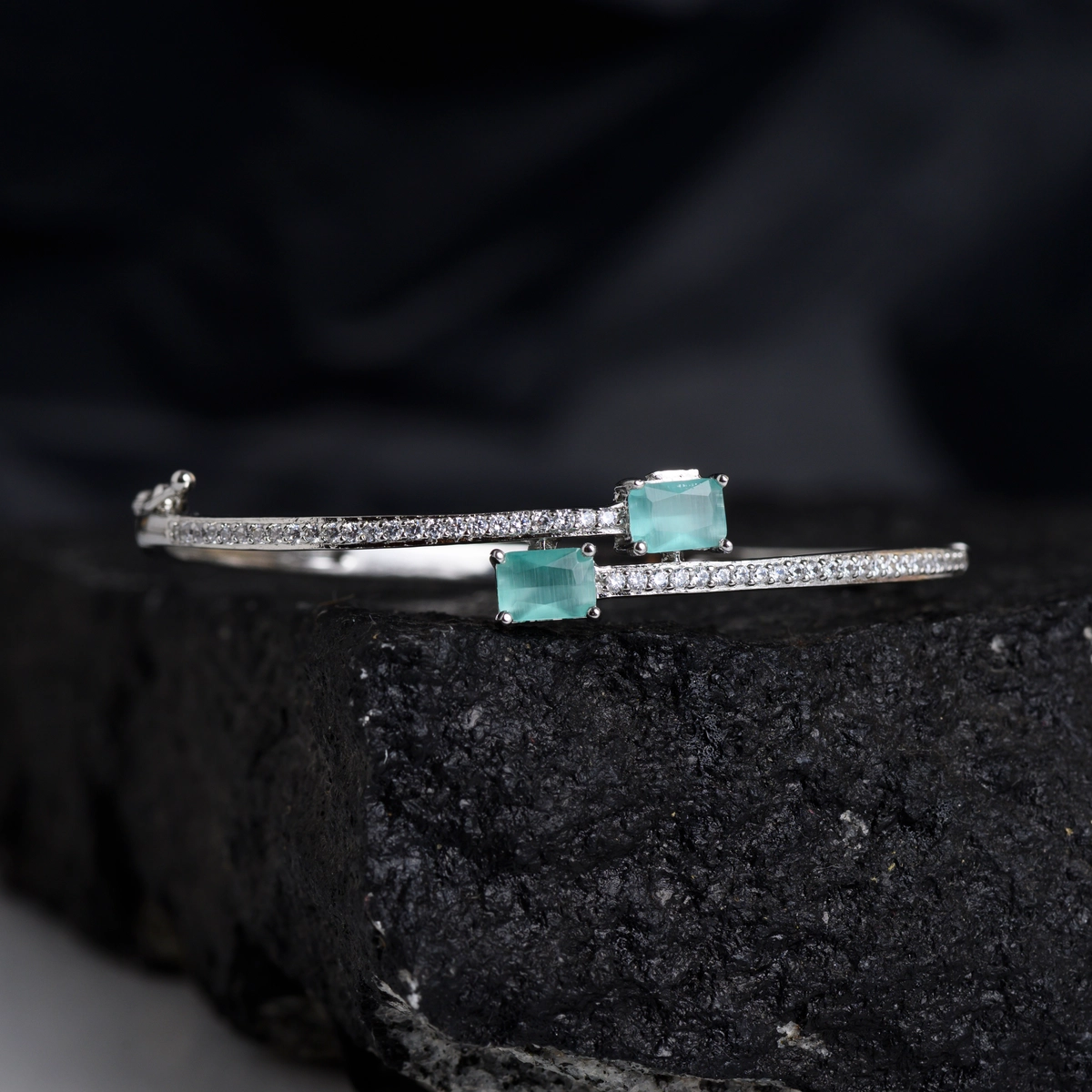 This Twin Green Stone CZ Bracelet is a refreshing 925 sterling silver bracelet adorned with twin aqua-green stones and sparkling CZ rows – sleek, elegant, and versatile.